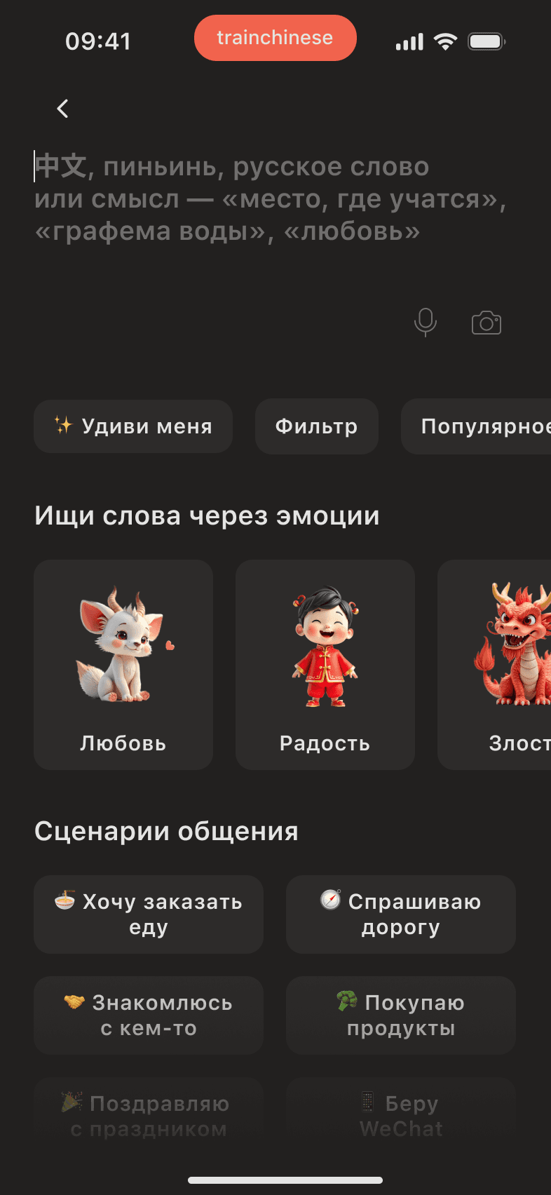 Поиск по эмоциям (эмодзи), сценариям, голосу/фото; фильтры по HSK, частоте, темам (еда, поездки)